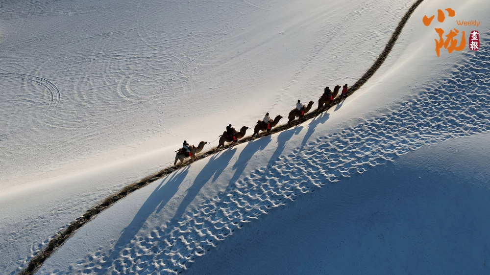 在沙漠里騎著駱駝,感受一下沙子和雪花交融在一起的觸感,這場(chǎng)大漠雪景為敦煌增添了很多迷人的感覺。