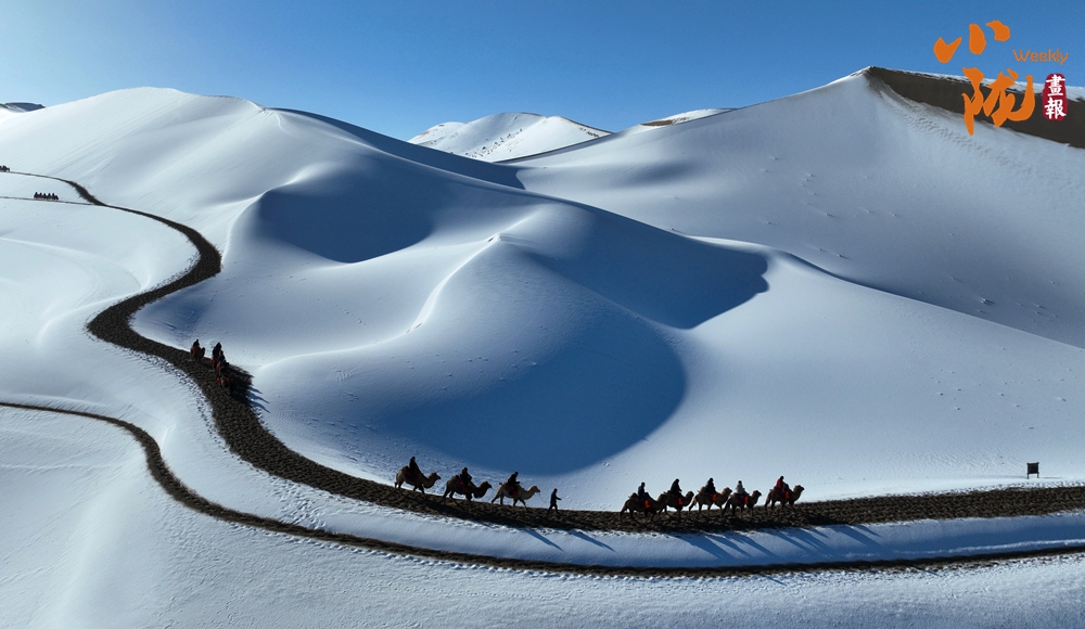鳴沙山上,連綿不絕的沙海披上銀裝,放眼望去,如詩(shī)如畫,美不勝收,吸引了不少游客騎著駱駝踏雪賞景。