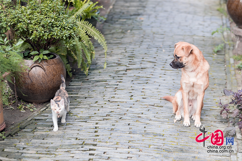 行在青石板路上,總會(huì)遇到不同的「原住民」和主人,狹路相逢時(shí),倏地就跑進(jìn)了自己的地盤。