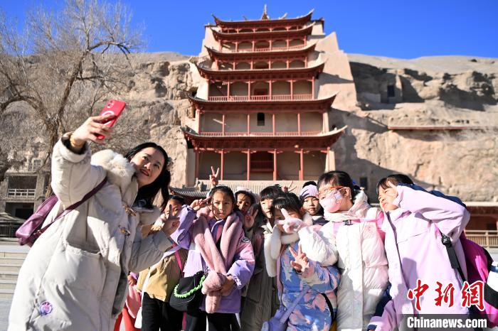敦煌文化研學(xué)正逐步成為敦煌旅游新時(shí)尚,莫高窟成為“研學(xué)養(yǎng)身養(yǎng)心”的學(xué)堂之一。連日來,中新社記者來到冬日的莫高窟,沒有了夏日的人聲鼎沸和如長龍的隊(duì)伍,多了更多青春面孔,穿著絢麗服飾、背著書包的學(xué)生,點(diǎn)綴著沉悶的戈壁土黃色。