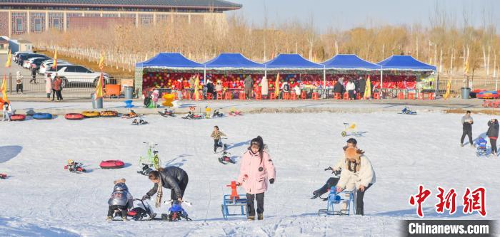 1月7日,游人在敦煌文博冰雪場(chǎng)體驗(yàn)雪地游玩項(xiàng)目。王斌銀 攝