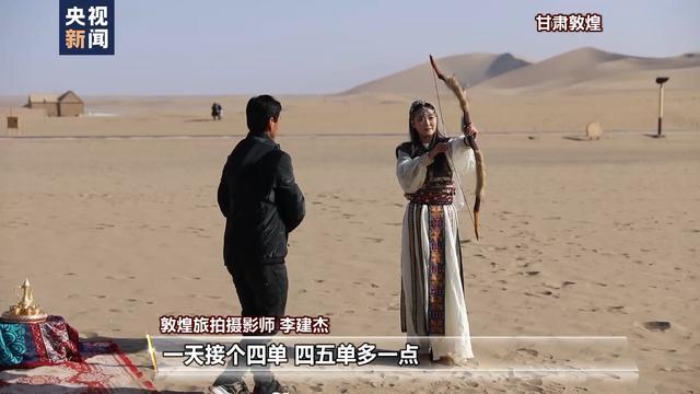 敦煌旅拍攝影師 李建杰:游客量變化還是挺大的,往年沒(méi)有這么多人。我作為一個(gè)攝影師,一天接四單,四五單多一點(diǎn)。