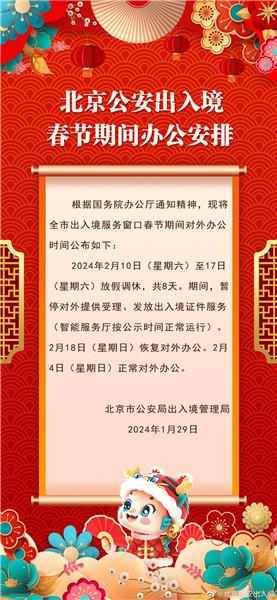 據(jù)北京市公安局出入境管理局官方微博消息,北京市公安局出入境管理局發(fā)布春節(jié)期間辦公安排:北京市出入境服務窗口2月10日至17日(大年初一至初八)放假調休,共8天。期間,暫停對外提供受理、發(fā)放出入境證件服務(智能服務廳按公示時間正常運行)。