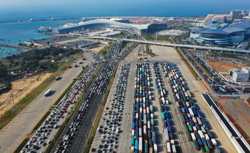 2月17日,大批車輛在海口市新海港等待登船(無(wú)人機(jī)照片)。新華社記者 郭程 攝