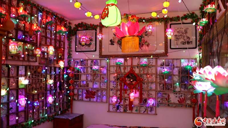 走進馬玉琳的家,精美的宮燈、雅致的荷花燈、喜慶的掛件、彩色的燈帶錯落有致地掛在木制格子架上,濃濃的年味兒撲面而來,數(shù)百盞彩色花燈同時點亮,將屋內(nèi)裝扮成“滿房燈火迎新春”的喜慶景象。