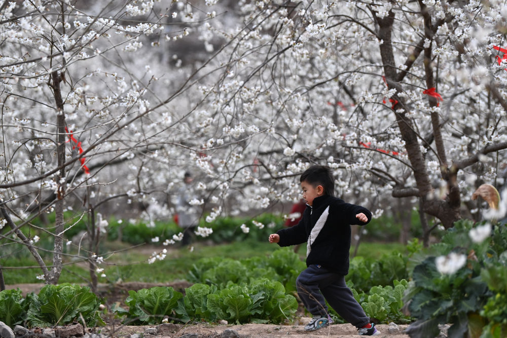 3月9日,一名小朋友在隴南市武都區(qū)城關鎮(zhèn)石家莊村的櫻桃樹下玩耍。新華社記者 陳斌 攝