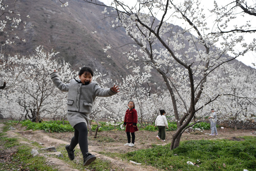 3月9日,幾名小朋友在隴南市武都區(qū)城關鎮(zhèn)石家莊村的櫻桃樹下玩耍。新華社記者 陳斌 攝