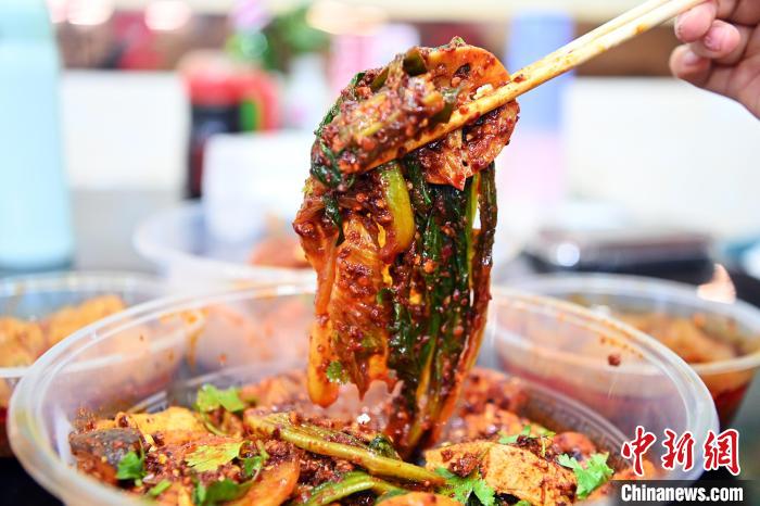 3月14日,甘肅省天水市秦州區(qū),食客展示裹滿紅油辣子的麻辣燙。九美旦增 攝