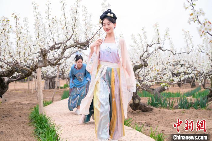 原標(biāo)題:山東萊陽萬畝梨花惹人醉 民眾著古裝游園