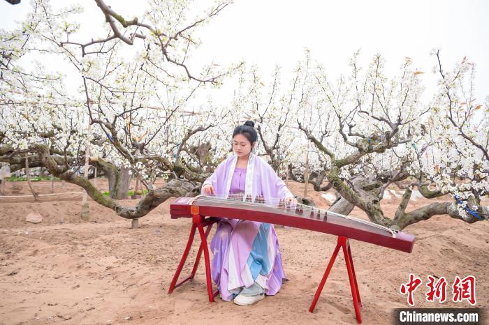 游客在梨園里彈古箏。紀(jì)欣宏 攝