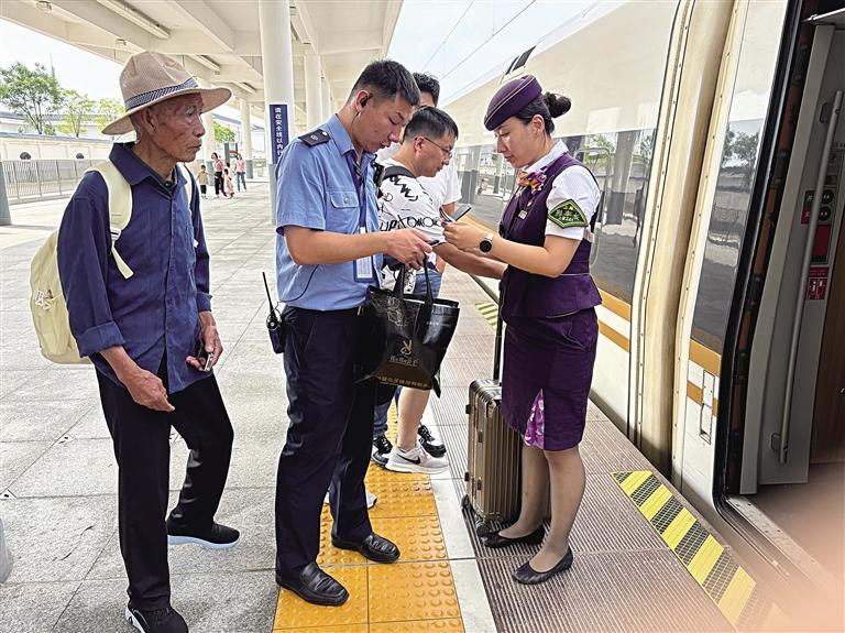 “站臺邊的旅客請往安全白線里走,帶小孩的旅客,看好自己的孩子!”這句話,每趟車劉鑫都要重復十多遍。暑運以來,列車密集到發(fā),短短3個半小時就到發(fā)列車17趟??瓦\值班員劉鑫不停地在不同站臺間來回奔波,不僅要與列車長辦理交接,而且要做好旅客乘降引導和安全防護。