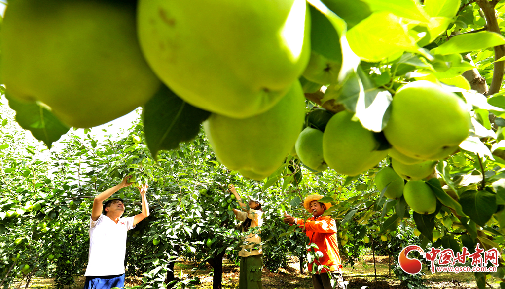 8月12日,在張掖市甘州區(qū)農墾張掖農場綠色果品種植基地,果農們正在采摘成熟的早酥梨,基地里一派果豐人忙的喜人景象。