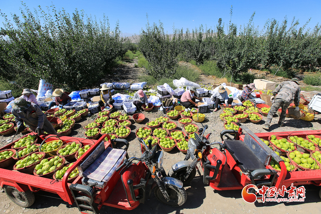 8月17日,位于祁連山下的甘肅省嘉峪關(guān)市文殊鎮(zhèn)豐源農(nóng)業(yè)科技示范園1850余畝戈壁早酥梨喜獲豐收,果農(nóng)們正忙著采摘、分揀、裝箱、儲存。