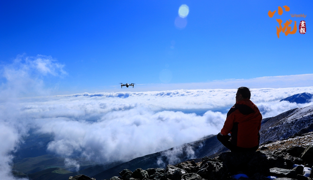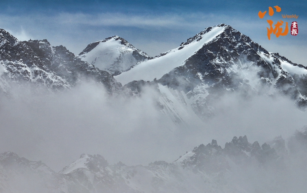 雪山山巒間,云霧回旋飄動,彌漫舒展,如海浪起伏、波濤滾滾一般,與湛藍天空相互映襯,壯美如畫。