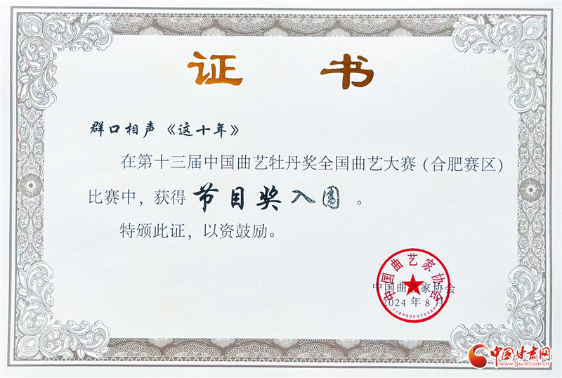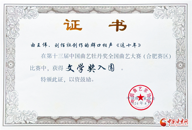 據(jù)了解,中國曲藝牡丹獎,是全國性曲藝藝術(shù)專業(yè)最高獎項。第十三屆中國曲藝牡丹獎全國曲藝大賽(合肥賽區(qū)),由中國文學藝術(shù)界聯(lián)合會、中國曲藝家協(xié)會、安徽省文化和旅游廳、安徽省文學藝術(shù)界聯(lián)合會、合肥市人民政府主辦,于8月18日至23日舉辦,是本屆牡丹獎四個分賽區(qū)中的最后一站,主要面向相聲、小品、“三書”類節(jié)目。中國曲協(xié)18家團體會員、中國曲協(xié)香港會員分會、中國曲協(xié)有關(guān)專業(yè)委員會、中直文藝院團以及省級文藝院團報送的節(jié)目參賽。期間,共收到480多個節(jié)目,48個節(jié)目入圍,《這十年》為甘肅地區(qū)唯一一件入圍作品。