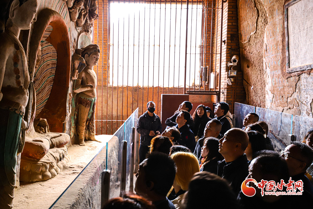 11月9日,甘肅省張掖市肅南裕固族自治縣馬蹄生態(tài)文化旅游景區(qū)金塔寺石窟內(nèi),甘肅百家旅行社的導游們正在仔細觀賞千年石窟。