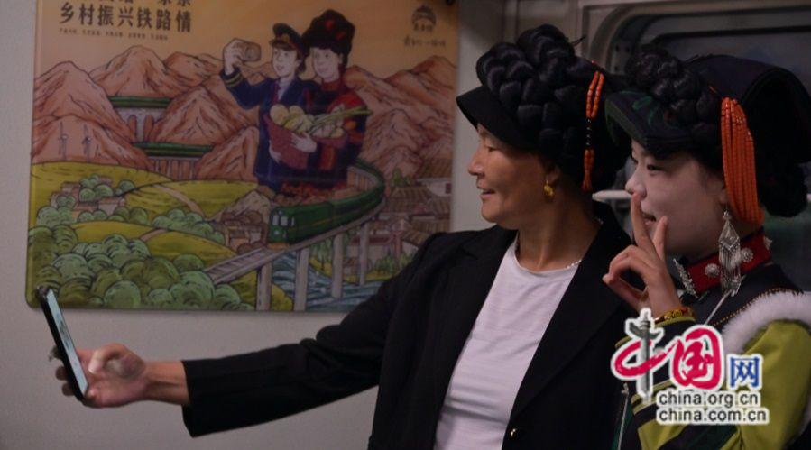 沿途,每當列車停靠在車站等待的時間,彝族老鄉(xiāng)在鐵路工作人員的協(xié)同配合下搬起水果,牽起牛羊,抱起雞鴨放進一節(jié)節(jié)行李車廂上,慢火車的貨架上擺滿了農(nóng)產(chǎn)品。車廂里,人們互相交談,圍坐在一起放聲歌唱,好不熱鬧,歡樂的聲音從車廂內傳出,像是在向廣袤的山川大地宣告著彝歷新年的盛事。