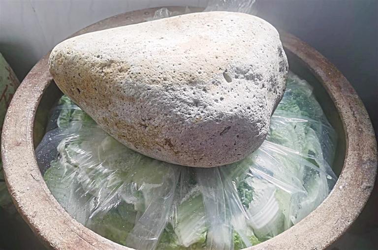 交談中,菜市場爺爺奶奶輩的老人說,除了囤好大白菜,“一口酸菜缸,一塊腌酸菜用的大石頭”也必不可少。“前一年缸里的菜吃完后,要把空缸倒扣在地面上,接上地氣,除去缸中的異味,然后洗干凈,晾干,來年再用。”老人家說,傳統(tǒng)的近半人高的醬色大缸一般都是家里的老人留下來的,那時候大家的生活條件不好,一家人的美食,都被腌制在壇壇罐罐里,甚至搬家都舍不得丟棄這口缸。腌菜用的壓菜石也是有講究的,先要夠分量,太小了壓不實(shí),太大了不方便取菜,也有人常常用幾塊卵石同時壓菜的辦法來解決;最好還要表面光滑、不扎手、好清洗,“基本都是黃河邊撿的石頭拿回去洗干凈用”。