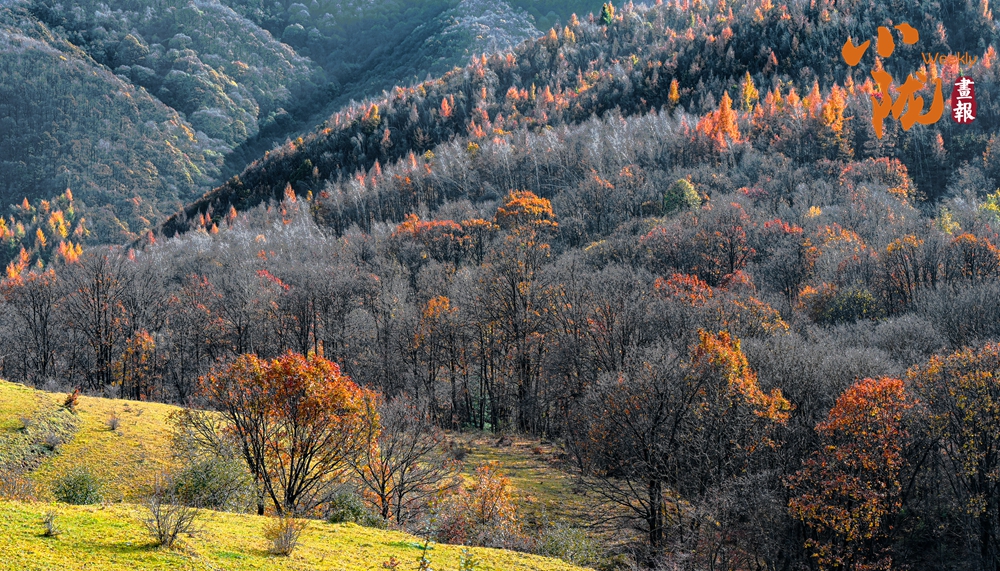 初冬時節(jié),華亭關(guān)山的楓葉漸漸褪去翠綠,染上了濃濃的金色,一幅色彩斑斕的美景。