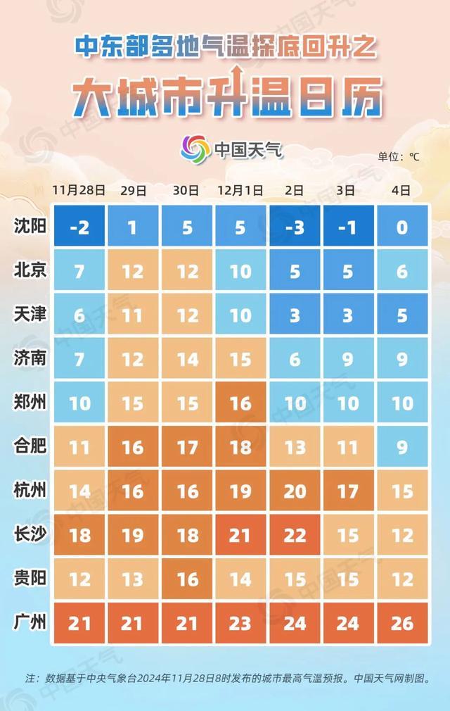 過去五天,今年下半年首場(chǎng)寒潮來勢(shì)洶洶,我國(guó)多地都度過了下半年來最冷的一天。隨著寒潮影響結(jié)束,中東部大部氣溫探底回升,今天(11月28日)起各地將陸續(xù)進(jìn)入升溫模式,長(zhǎng)江中下游等地有望沖擊20℃。中國(guó)天氣網(wǎng)推出大城市升溫日歷,看你家何時(shí)上演冷暖逆轉(zhuǎn)。