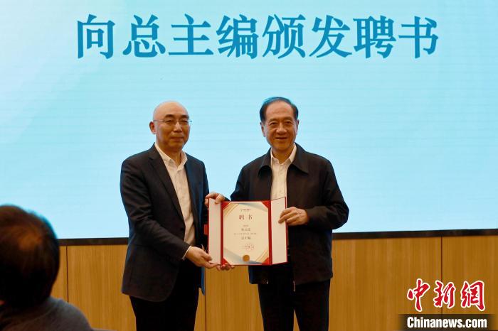 上海世紀(jì)出版集團(tuán)黨委副書記、總裁闞寧輝向韓啟德總主編頒發(fā)聘書?!∩倌陜和霭嫔?nbsp;供圖