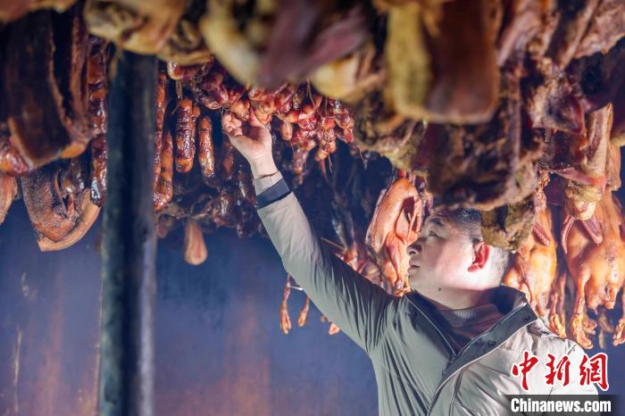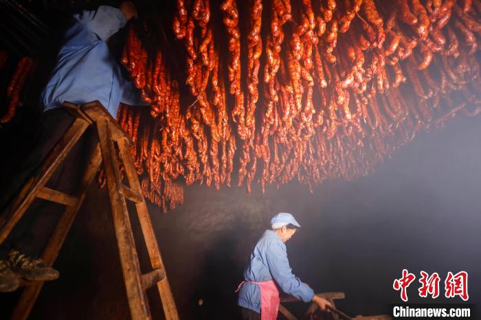圖為貴州施秉一企業(yè)工人在下架剛熏制好的香腸。新年臨近,貴州省黔東南苗族侗族自治州施秉縣部分農(nóng)戶和企業(yè)紛紛加工趕制臘肉、香腸、血豆腐等傳統(tǒng)臘味,通過“線上+線下”銷售方式,供應(yīng)市場(chǎng),喜迎新年。磨桂賓 攝