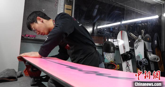 雪板維護師齊宇峰正在維護雪板。(受訪者供圖)