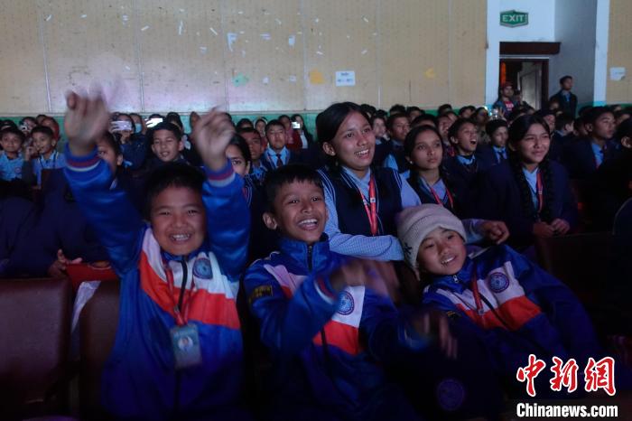 2月20日,中尼跨國新春文藝晚會在尼泊爾博克拉舉行,尼泊爾學(xué)生在聽到博克拉國際機(jī)場開通首條定期國際航線時歡呼雀躍。 中新社記者 崔楠 攝