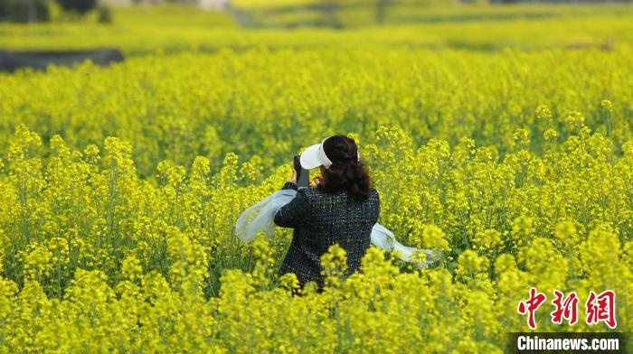 近日,云南省騰沖市界頭鎮(zhèn)成片的油菜花盛開(kāi),吸引不少游客前來(lái)觀光。金黃的油菜花海與遠(yuǎn)處白墻黛瓦的村落相映成趣,共同繪就一幅寫(xiě)意的水墨畫(huà)。圖為游客拍攝油菜花田。趙輝  攝