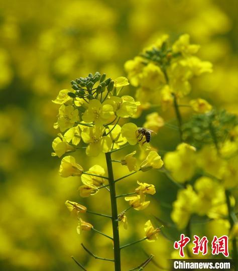 近日,云南省騰沖市界頭鎮(zhèn)成片的油菜花盛開(kāi),吸引不少游客前來(lái)觀光。金黃的油菜花海與遠(yuǎn)處白墻黛瓦的村落相映成趣,共同繪就一幅寫(xiě)意的水墨畫(huà)。圖為油菜花吸引蜜蜂采蜜。趙輝  攝