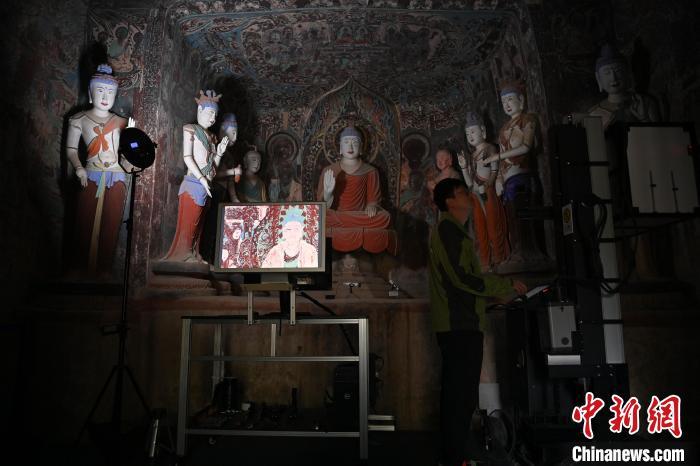 2024年6月5日,甘肅省敦煌市莫高窟內(nèi),敦煌研究院文物數(shù)字化研究所工作人員進行敦煌壁畫數(shù)字化采集工作。 中新社記者 李亞龍 攝