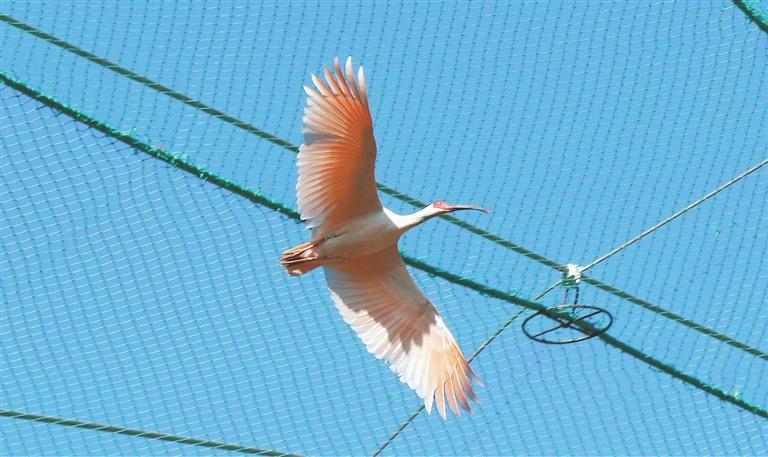 小隴山龍門(mén)林場(chǎng)朱鹮生態(tài)園中展翅翱翔的朱鹮。