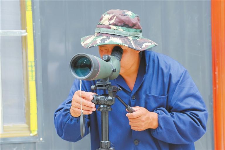 宋治平通過(guò)單筒望遠(yuǎn)鏡觀察朱鹮。 新甘肅·甘肅日?qǐng)?bào)記者 馮樂(lè)凱