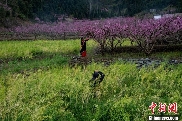 時下正是桃花盛開的時節(jié),在廣西田林縣浪平鎮(zhèn)浪平村,村民種植的桃花競相綻放。滿樹繁花與錯落村舍相互映襯,還有樹旁玩耍的孩童、樹下勞作的村民,動靜交織,構成一幅絕美的田園春景圖。圖為3月15日,在廣西田林縣浪平鎮(zhèn)浪平村,村民在桃樹下勞作。黃數(shù)情 攝