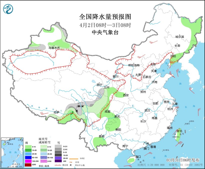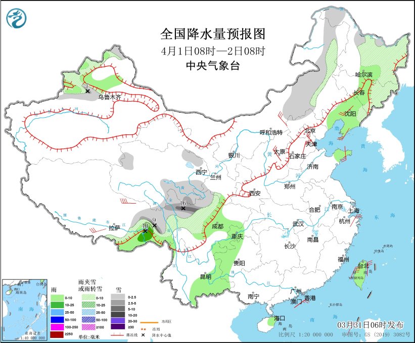 4月1日08時(shí)至2日08時(shí),內(nèi)蒙古東部、黑龍江中東部、吉林東部、遼寧東北部、新疆西北部山區(qū)、西藏東部、青海南部、川西高原北部等地部分地區(qū)有小到中雪或雨夾雪,其中,新疆沿天山地區(qū)、西藏東部、川西高原北部等地部分地區(qū)有大雪,局地暴雪(10~16毫米)。新疆伊犁河谷和北疆盆地、西藏東南部、吉林中部、遼寧大部、山東半島、西南地區(qū)東部和南部、海南島東部、臺灣島等地部分地區(qū)有小到中雨,其中,西藏東南部等地局部地區(qū)有大雨(25~40毫米)。西藏南部、內(nèi)蒙古中部、遼寧中南部、河北中南部、天津、山西、山東半島、浙江東部等地部分地區(qū)有4~6級風(fēng),西藏東部部分地區(qū)有6~7級風(fēng);渤海、渤海海峽、黃海西部、東海南部、臺灣海峽、臺灣以東洋面、巴士海峽、南海中北部海域有6~7級風(fēng),陣風(fēng)8級。