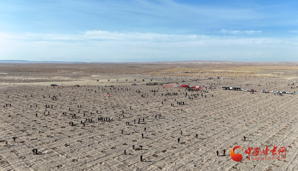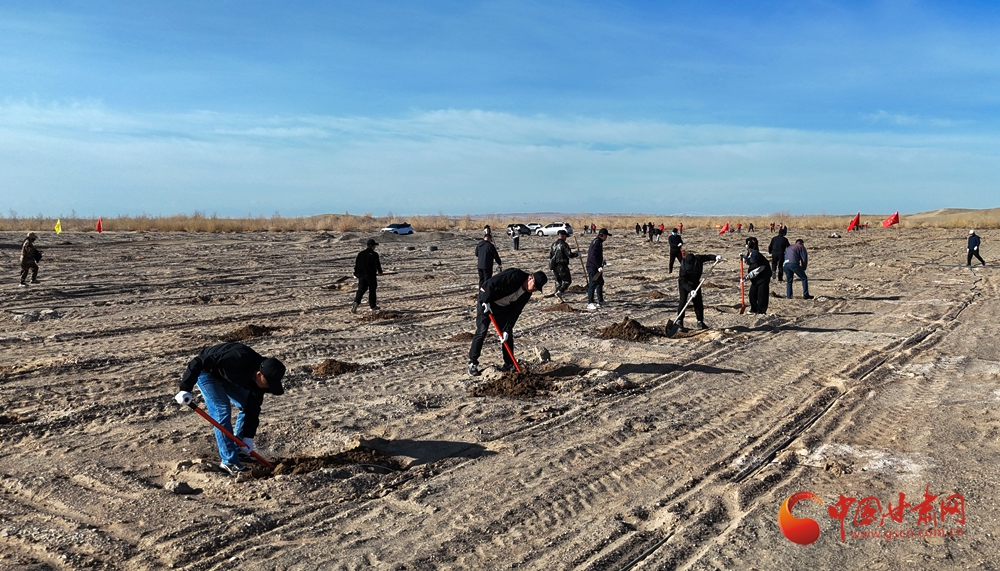 4月9日,酒泉市金塔縣金核公路城西義務植樹基地,來自酒泉市直機關和金塔縣的干部職工以及學生開展義務植樹活動。