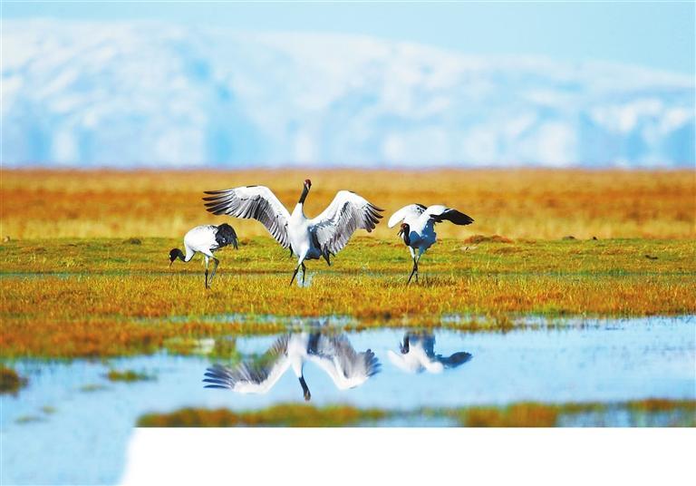 尕海湖的晨霧尚未散盡,黑頸鶴的赤紅色頭頂已經(jīng)開始閃現(xiàn)。它們在苔草間跳起求偶之舞,頭頂?shù)闹旒t隨舞步明滅,如同螢火蟲的閃光。新孵化的雛鶴,棕黃色絨羽間染著乳白,是大地贈予新生命的第一抹色彩。這種國家一級保護動物蹣跚學步時,總被親鳥用長喙輕推,這場景會令保護區(qū)巡護員想起女兒初學自行車時自己的緊張。