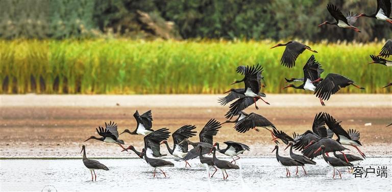 九月的黑河濕地,蘆葦蕩在秋陽下鍍成金箔,黑鸛群如流動的墨玉鑲嵌其中。這種因其配色和珍稀程度被稱為“鳥中熊貓”的珍禽,是出色的捕魚能手。隨著它精準鎖定水下獵物,赤紅色長喙掠過水面,黑、白、紅的絕色搭配如同流動的墨畫。中國最大的黑鸛種群——600余只在此集結,夜棲時其倒影連成一線,讓觀鳥者想起傳世的水墨長卷。