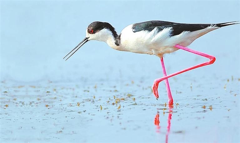 黑翅長腳鷸靜立淺灘時,恍若隨手放置的抽象雕塑——血紅色長腿占體長的三分之二,又仿若踩著高蹺的芭蕾舞者,每一步都能踏碎水面的金色霞光。一窩繁殖失敗的親鳥開始了第二次嘗試,它們將巢穴鋪設在湖畔,簡陋的碟狀巢,宛如浮于沼澤中的小舟。巢中往往是四枚橄欖色的梨形卵,點綴著不規(guī)則的黑褐色斑紋。雌雄輪流孵化,盡顯溫情。它行走時步履如詩般閑逸,卻在奔跑中暴露出笨拙的一面,如優(yōu)雅與窘迫并存。當觀鳥者的影子掠過濕地,它便以頭顱叩擊空氣作警鐘,繼而振翅離去。
