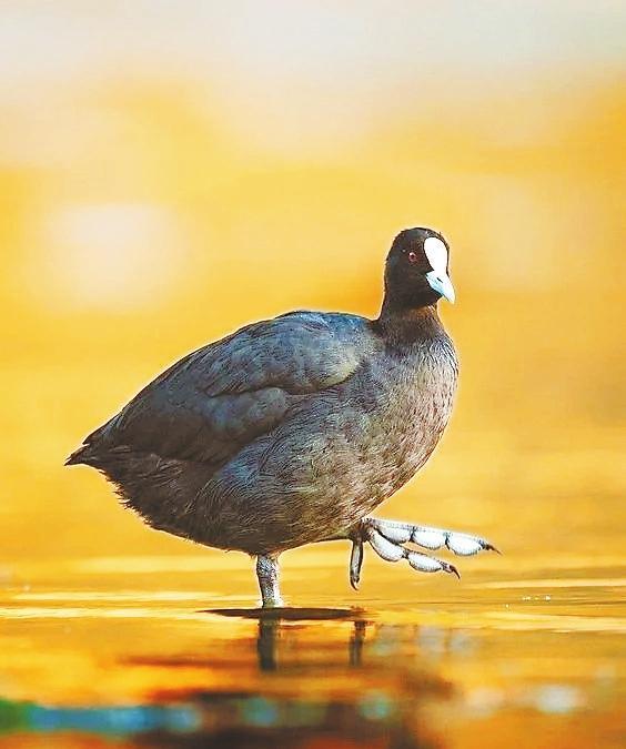 白骨頂又被喚作骨頂雞,卻是鶴類的遠親。它靜浮水面時,額前一抹象牙白,宛若遺落人間的墨玉鎮(zhèn)紙。這枚額甲實為特化的角質(zhì)層,是為了保護頭部的盔胄?;野咨陌牾肴缪┑匮グ惆洪g,劃開水藻時泛起粼粼波光——這身黑羽配雪蹼的穿搭,竟比時裝周的極簡主義更先鋒。當它們列隊掠過蘆葦蕩,水淼勾勒的剪影里,仿佛在繪制著秋天的信箋。
