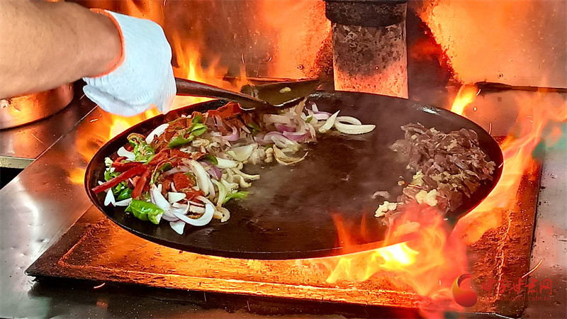 如今,炒撥拉已經(jīng)成為山丹人日常生活中不可或缺的一部分。在焉支巷子,游客可以看到多家炒撥拉店,每家店都有其獨特的炒制技藝和風(fēng)味。店家將切好的羊肝、肺、肚、腸、心等佐以洋蔥、青椒下入一個鑄鐵鏊子里,再加上幾勺鹽和辣椒面,開始用猛火爆炒。火星四濺,一頓撥拉之后,待到七分熟左右再放入提前準(zhǔn)備好的白餅塊一起翻炒即可。不一會兒,一鍋美味可口、熱熱乎乎的炒撥拉就制作完成了。