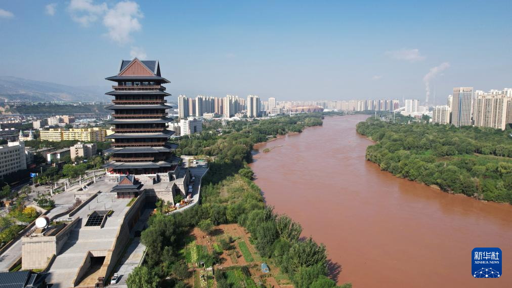這是位于黃河蘭州段南岸的黃河樓(2024年9月26日攝,無人機照片)。新華社記者 陳斌 攝