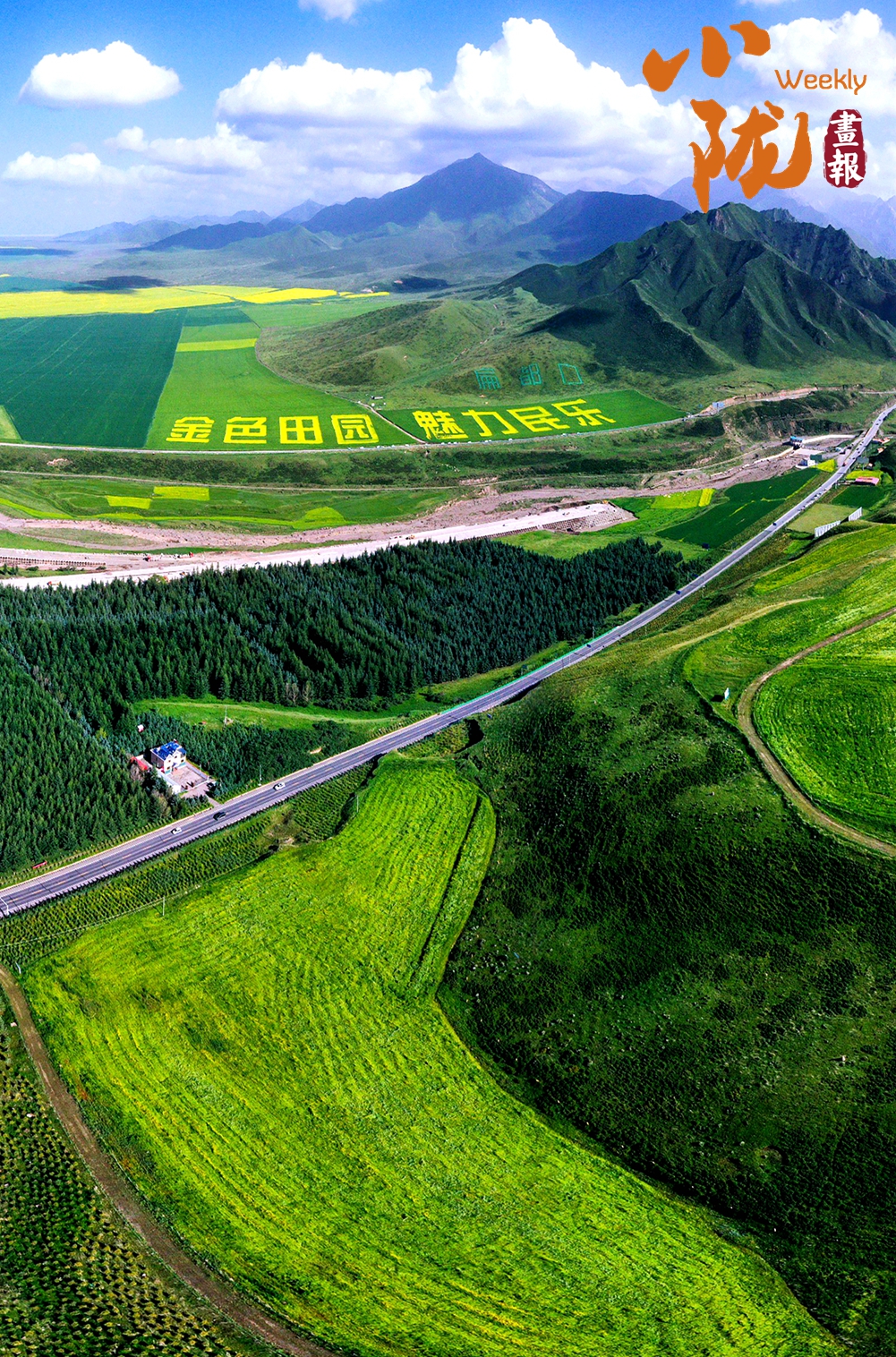 廣袤無邊的田野生機盎然,金黃色的油菜花夾雜著一塊塊碧綠色的麥田,好像給大地鋪上了一層五顏六色的大地毯。漂亮的民居鑲嵌其中,與祁連山相互輝映,在陽光下美麗極了!