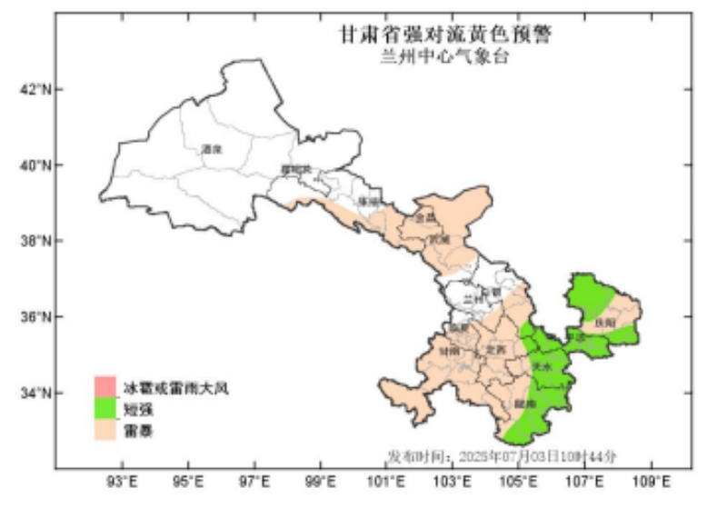 蘭州中心氣象臺(tái)2025年7月3日10時(shí)44分繼續(xù)發(fā)布強(qiáng)對(duì)流黃色預(yù)警:預(yù)計(jì)未來24小時(shí),張掖、金昌、武威、蘭州、白銀、甘南、臨夏、定西、隴南、天水、平?jīng)?、慶陽等州市有雷暴,其中隴南、天水、平?jīng)?、慶陽等市部分地方及白銀、定西兩市局部地方有短時(shí)強(qiáng)降水,最大小時(shí)雨強(qiáng)20-60mm;隴南、天水、平?jīng)?、慶陽等市強(qiáng)降水在未來24小時(shí)內(nèi)多發(fā),白銀、定西主要強(qiáng)降水時(shí)段在4日2-8時(shí)。請(qǐng)注意防范!