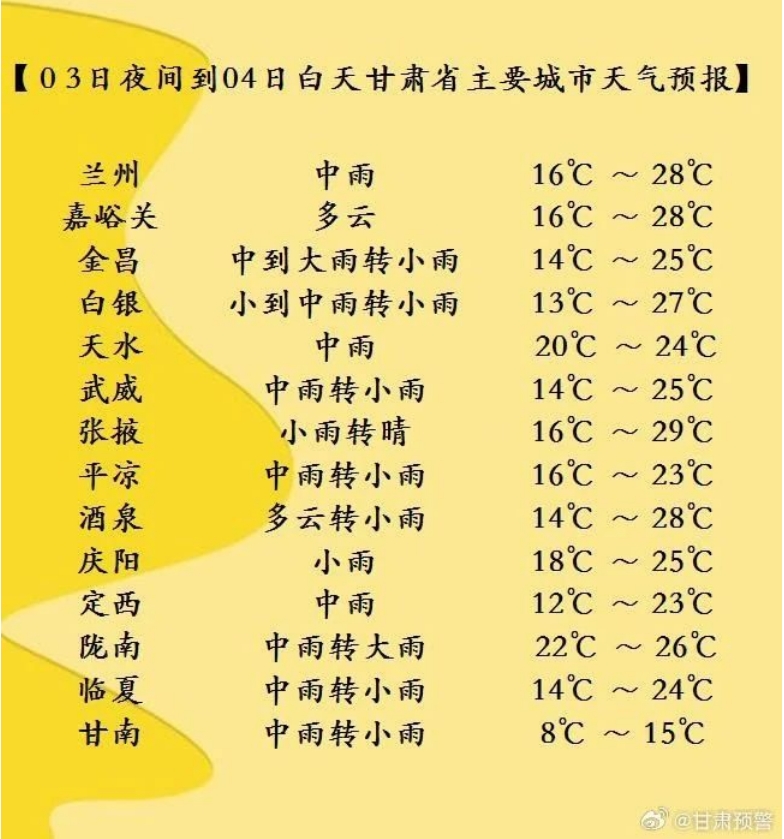今天夜間到明天白天(7月3日20時(shí)-7月4日20時(shí)),酒泉、嘉峪關(guān)、張掖三市多云間陰,局部地方有小雨,祁連山區(qū)有中到大雨;省內(nèi)其余地方陰有小到中雨,其中隴南、天水、平?jīng)?、慶陽等市局部地方及定西、甘南兩市州東部、白銀市南部有暴雨。