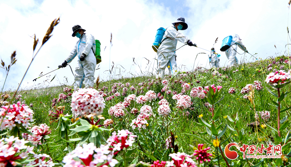 盛夏時節(jié),位于張掖市肅南裕固族自治縣的皇城夏日塔拉草原、康樂賽汗塔拉草原,宛如一塊巨大的綠色絨毯鋪向天際,滿目翠綠,令人心醉神迷。然而,此時也正是草原上狼毒花毒害草盛放、蝗蟲繁殖的高峰期。連日來,肅南縣林草專業(yè)技術(shù)人員帶領(lǐng)2000多牧民,抓住毒害草開花、蝗蟲繁殖最快,也是清除滅殺的最佳時機,在“三北”工程六期160多萬畝廣袤的草原上,打響了以“蟲害防治+害草治理+噴施葉面+播撒草籽的”為核心的“三北”工程林草濕荒一體化保護修復(fù)攻堅戰(zhàn)。