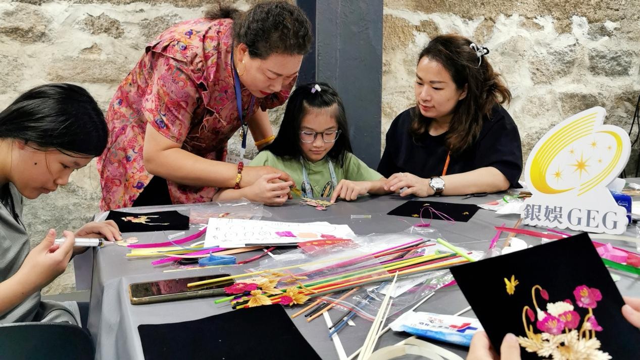(唐彩萍在澳門教小朋友制作麥稈畫)