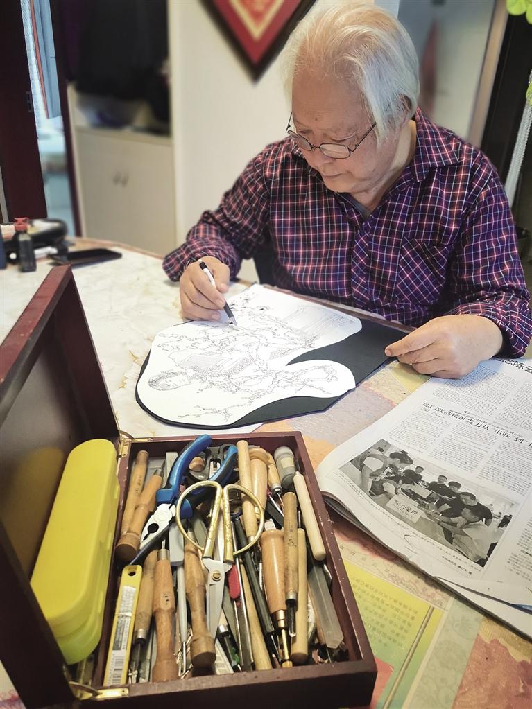 談到創(chuàng)作過程,他眼神中閃爍著匠人的嚴謹光芒:“剪一個好作品,首先要有一個構(gòu)思,然后再把它畫出來,再去動剪刀、刻刀各種工具。” 在他這里,剪紙絕非簡單的“剪花樣”,而是嚴謹?shù)乃囆g(shù)創(chuàng)作,是“胸有成竹”后的“運剪如風”。