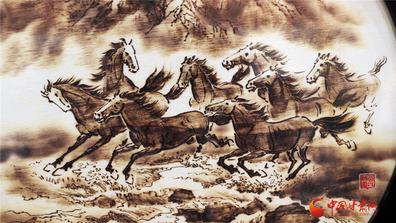 從學(xué)徒到代表性傳承人,張志光的堅(jiān)守藏在日復(fù)一日的練習(xí)里。他不僅精通山丹烙畫(huà)的選材、畫(huà)面設(shè)計(jì)及裝飾工藝,更在2018年邁出創(chuàng)新步伐——將山丹馬元素融入創(chuàng)作。手持電烙鐵在木板上游走,他筆下的山丹馬或奔騰跳躍、或昂首嘶鳴,線條流暢、明暗有致,仿佛被賦予生命,盡顯西北大地的豪邁神韻。“山丹烙畫(huà)是我一生的熱愛(ài),早成了生活里離不開(kāi)的部分。”張志光的話語(yǔ)里,滿是對(duì)這門(mén)技藝的深情。