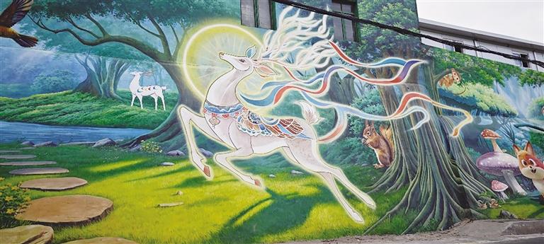 這些色彩斑斕的墻繪以城關(guān)區(qū)深厚的文化底蘊(yùn)為底色,將民俗風(fēng)情、自然生態(tài)與城市記憶巧妙交織。在伏龍坪街道,一面巨幅“舞獅”墻繪氣勢恢宏,紅黃相間的獅子昂首騰躍;在山間步道旁,“九色鹿”悠然立于云霧之間,靈動(dòng)雙眸映照山河,將敦煌文化的神秘與自然之美娓娓道來。